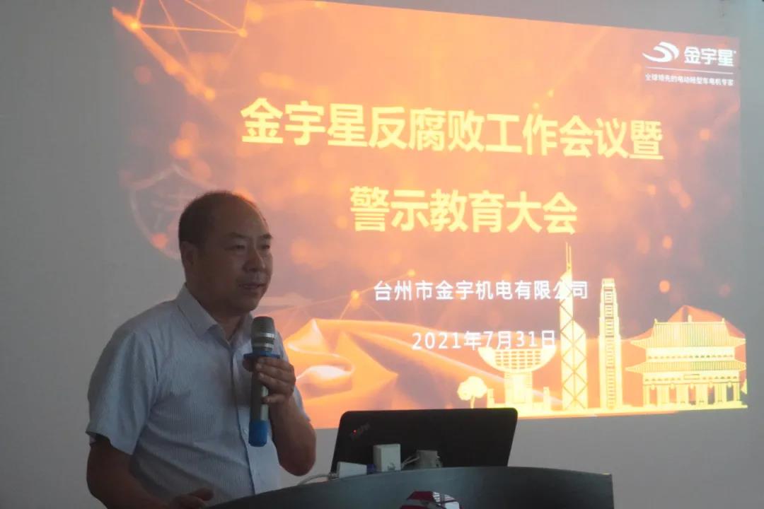 7月31日下午,為進一步貫徹落實公司反腐敗、反賄賂工作的部署,營造風清氣正的發展環境,堅定不移地推動反腐敗和廉潔自律工作向縱深發展,金宇星在黃巖總部召開了反腐敗工作會議暨警示教育大會,全體管理人員及關鍵核心崗位120余人參加,董事長王加許發表了重要講話并明確指示,對腐敗實行零容忍,任何人都不允許觸及此高壓線,會議分為四個議程展開。